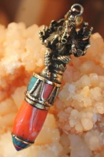 ขลิบลายเดินเส้นสีทองฝังเทอร์ควอยซ์กับปะการังไว้ที่ใต้ฐาน  สวยงามมากๆ งานประดิษฐ์จากเนปาล